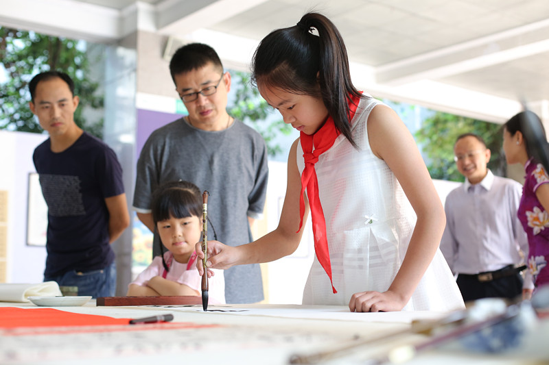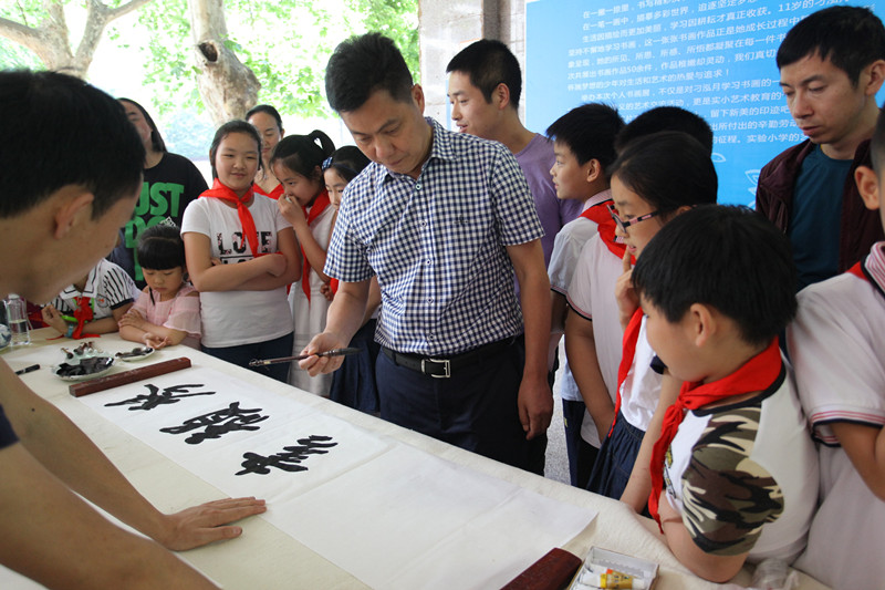 在活动现场,书画名家挥毫泼墨,并结合展出作品,为同学们讲解了书画创作的基本常识。刁鸿月同学手书“见贤思齐”四个楷书大字,表达了对艺术前辈的敬仰之情。这次活动既是绵阳实验小学素质教育成果的一次展示,也是市文联、市书画院文艺志愿服务进校园的一次重要活动。在互动交流中,一粒粒艺术的种子播进了孩子们的心田,书画家与实小师生以书法、绘画的形式迎接“六一”国际儿童节。(文/图 李健 王力)