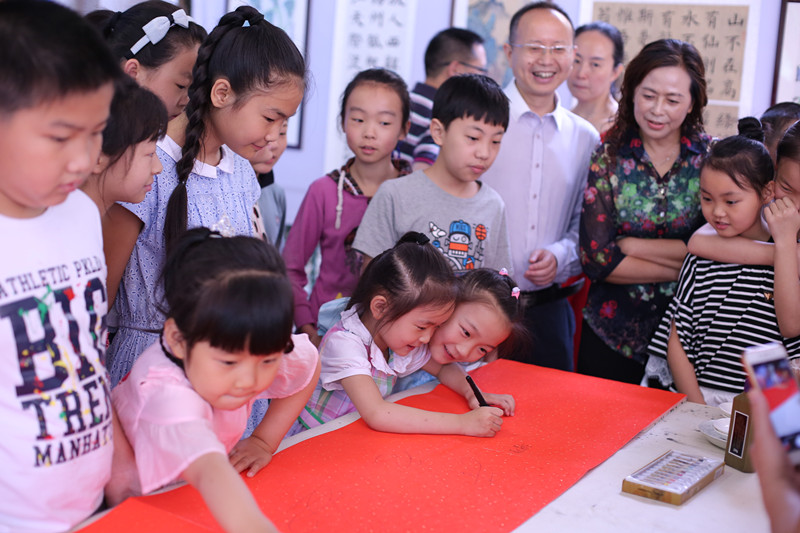 绵阳市文学与书画艺术研究院院长、市书协主席龚小膑在指导孩子们书法