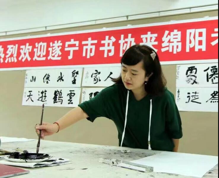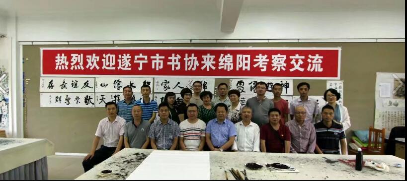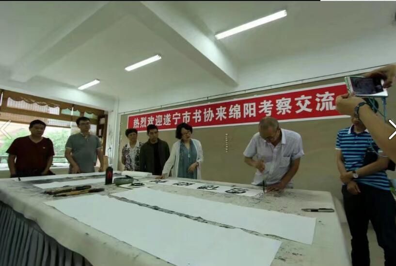 9月15日,遂宁市文联副主席周利民带领遂宁市书法家协会代表团一行17人来绵进行考察交流。市文联党组成员、副主席何骥,市文学与书画艺术研究院院长、市书协主席龚小膑及绵阳市书协部分代表热情接待了周主席一行,并陪同参观了市文联展览馆、文研院创作室,组织座谈会和交流笔会等活动。